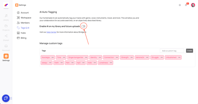 In your workspace settings, you'll also have the possibility to disable automatic music tagging. You'll have to go in the Tags & AI tab of your settings.