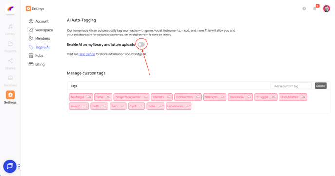 Dans les paramètres de votre workspace, vous aurez également la possibilité de désactiver l’auto-tagging musical. Il vous faudra aller dans l’onglet Tags & AI de vos paramètres.